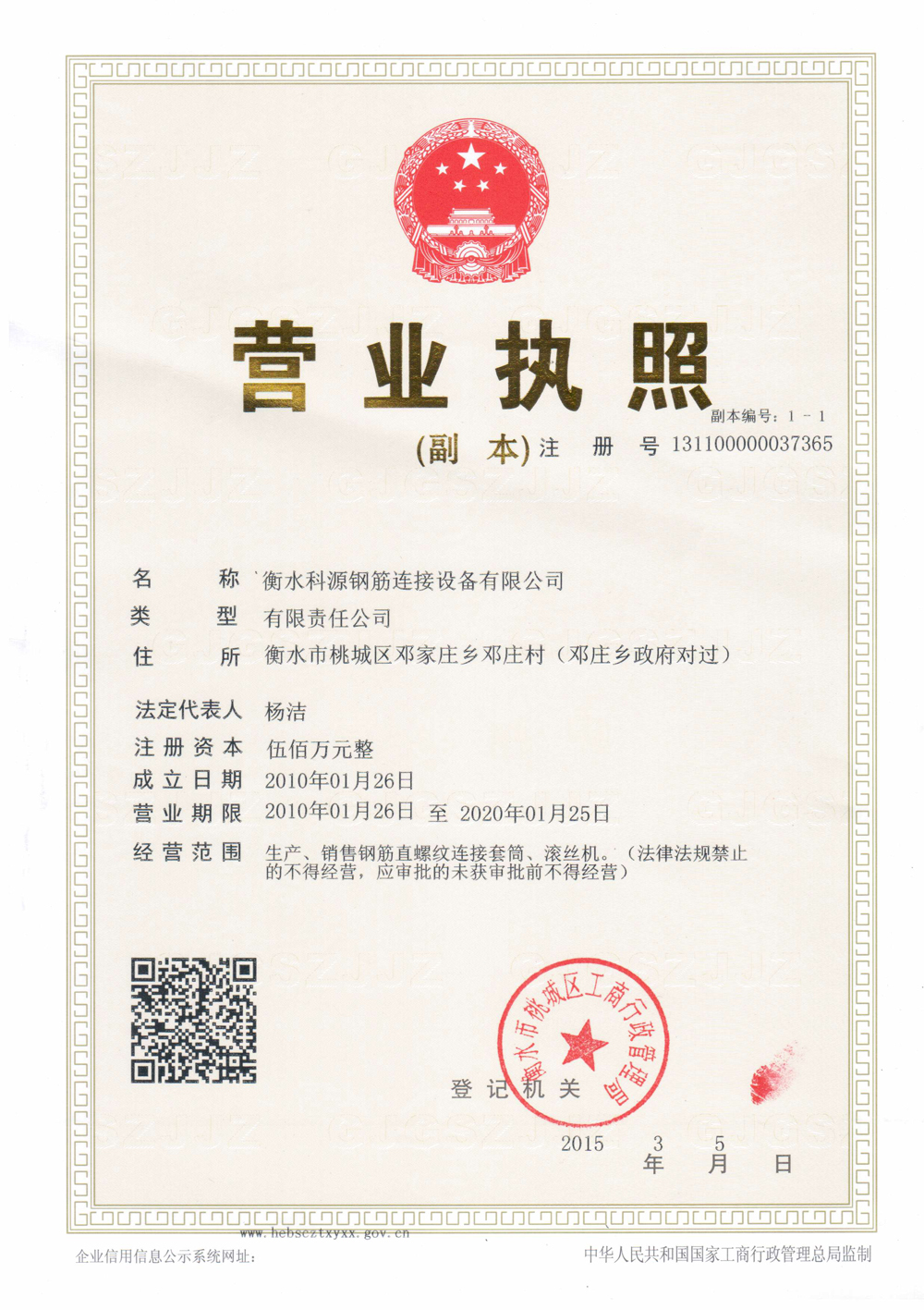 開增值發(fā)票不用愁了,衡水科源鋼筋連接設(shè)備有限公司適應(yīng)建筑營改增的需要,由小規(guī)模辦成一般納稅人,同時注冊資金增加到500萬,可以更好方便跟客戶及各大建筑公司合作。