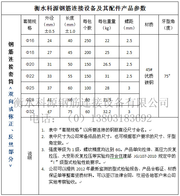 鋼筋剝肋滾軋直螺紋連接,就是將待連接鋼筋端部的縱肋和橫肋用切削的方法剝掉一部分,然后直接滾軋成普通直螺紋,用特制的直螺紋套筒連接起來,形成鋼筋的連接。鋼筋連接套筒特點1、使用鋼筋連接套筒可以降低材料的使用,而且操作簡便,不受鋼筋成份種類限制。2、鋼筋連接套筒可提前預(yù)制,不占工期,加工效率高。3、連接方便、快捷、簡單,施工不用電,風(fēng)雨無阻,可全天候施工。4、可連接橫、豎、斜向的HRB335、HRB400、HRB500同徑或異徑鋼筋。服務(wù)方式 1、提供φ16-φ40mm規(guī)格鋼筋的直螺紋連接套筒2、提供鋼筋直螺紋加工設(shè)備3、負(fù)責(zé)施工現(xiàn)場技術(shù)培訓(xùn)及設(shè)備維修服務(wù)。直螺鋼筋連接套筒規(guī)格型號如下: φ16-φ40普通鋼筋連接套筒、異徑鋼筋連接套筒、可調(diào)鋼筋連接套筒、特殊型鋼筋連接套筒。