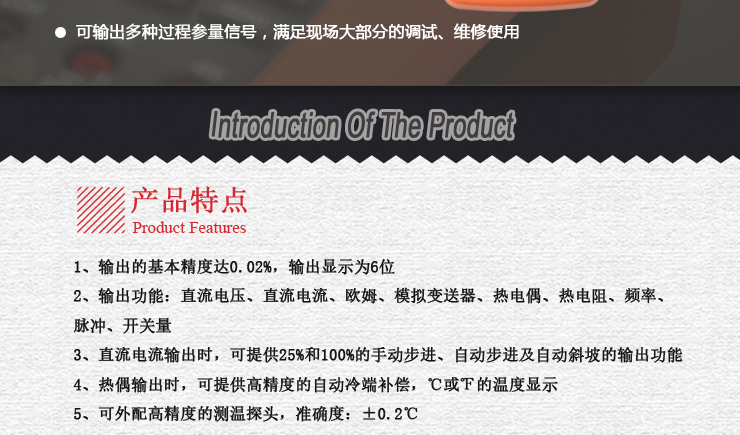 具有高精度輸出現(xiàn)場所需的各種過程參量,適用于現(xiàn)場溫度變送器、壓力變送器、DCS、PLC等系統(tǒng)的調(diào)試和校準(zhǔn),并在石油化工、生物制藥、工業(yè)自動化、大專院校和科研機(jī)構(gòu)等領(lǐng)域的得到了廣泛的應(yīng)用。