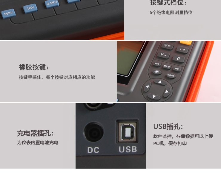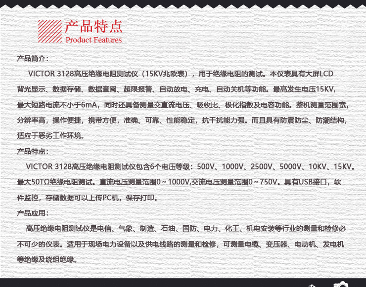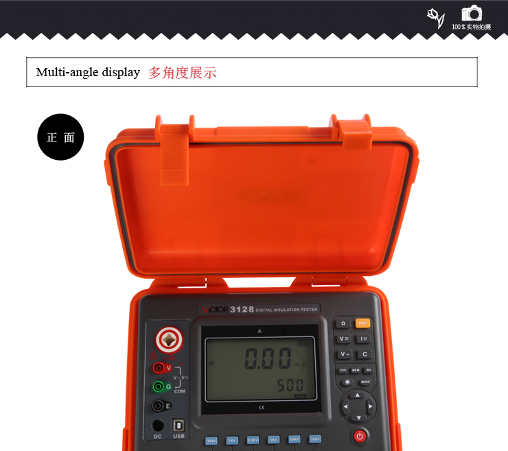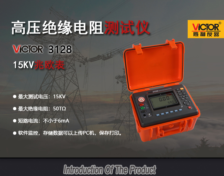 VICTOR 3128 高壓絕緣電阻測試儀包含6個電壓等級:500V、1000V、2500V、5000V、10KV、15KV。最大50TΩ絕緣電阻測試。直流電壓測量范圍0~1000V,交流電壓測量范圍0~750V。具有USB接口,軟件監(jiān)控,存儲數(shù)據(jù)可以上傳PC機,保存打印。