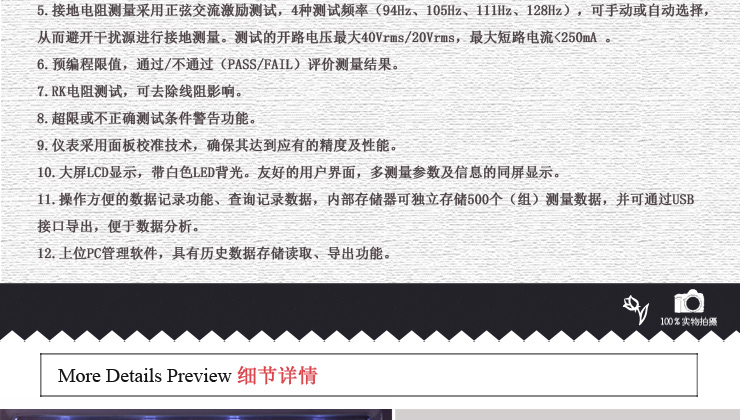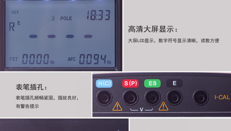 l 接地電阻測量采用正弦交流激勵測試,4種測試頻率(94Hz、105Hz、111Hz、128Hz),可手動或自動選擇,從而避開干擾源進行接地測量。測試的開路電壓最大40Vrms / 20 Vrms,最大短路電流<250mA 。