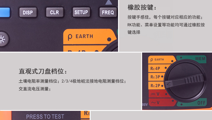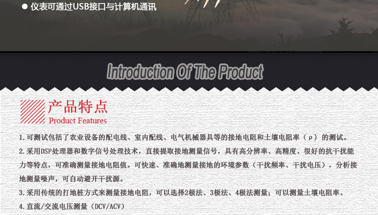 ①地樁法:采用傳統(tǒng)的打地樁方式來測量接地電阻,可以選擇2極法、3極法、4極法測量;可以測量土壤電阻率。