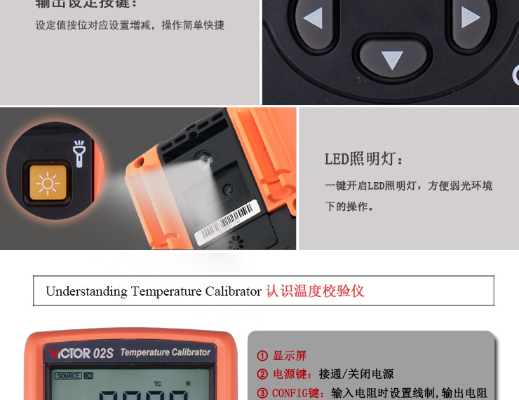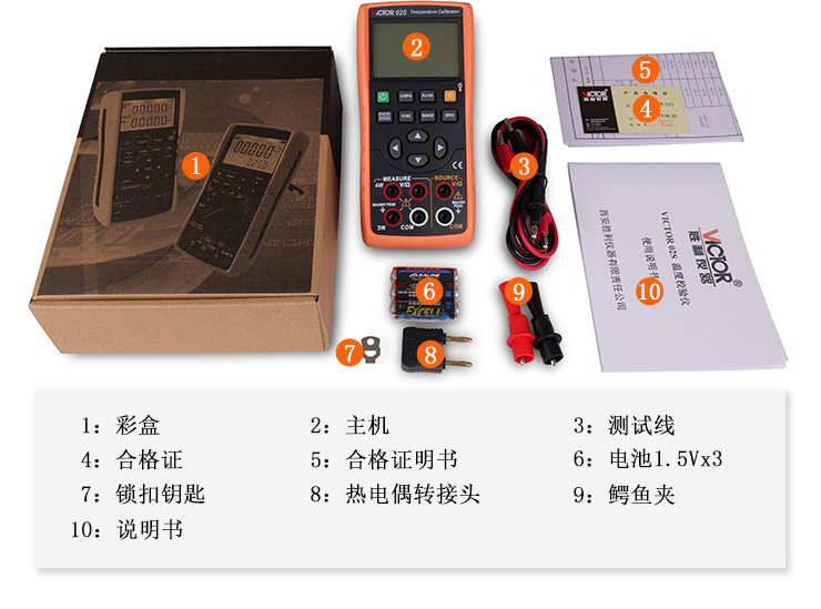 VICTOR 02S溫度校驗儀(以下簡稱校驗儀)是一個由電池供電,能測量和輸出電參數(shù)和物理參數(shù)的手持便攜式儀器。可用于測量直流電壓、電阻、熱電偶、熱電阻;模擬輸出直流電壓、電阻、熱電偶、熱電阻。