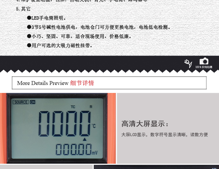 * 基本功能:直流電壓DCV、電阻OHM、熱電偶TC、熱電阻RTD