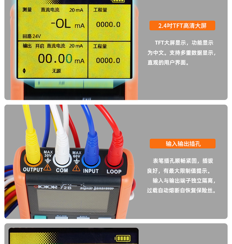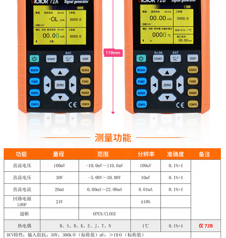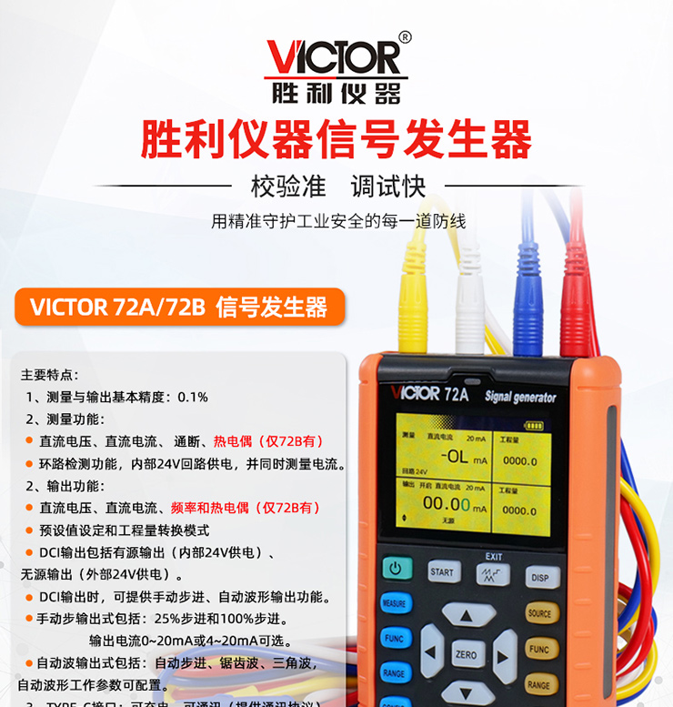 VICTOR 72B是一款鋰電池供電的便攜式掌上信號(hào)發(fā)生器,可用于測量直流電壓、直流電流、通斷,可模擬輸出直流電壓、直流電流、熱電偶、頻率。適用于現(xiàn)場變送器、DCS、PLC等系統(tǒng)的調(diào)試和校準(zhǔn)。VICTOR 72B在石油化工、生物制藥、工業(yè)自動(dòng)化、大專院校和科研機(jī)構(gòu)等領(lǐng)域的得到了廣泛的應(yīng)用,是工程師、技術(shù)工人及科研人員的“口袋級”實(shí)用工具。