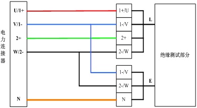 為了實現(xiàn)能夠分別測量AC380(500V)制式和DC600(1000V)制式下的線間、線對地多路的絕緣值;依托我們成熟的絕緣測試部分,增加通道切換功能,連接到客車電力連接器上,一鍵式滿足各種組合的絕緣測試,具體見下圖:
