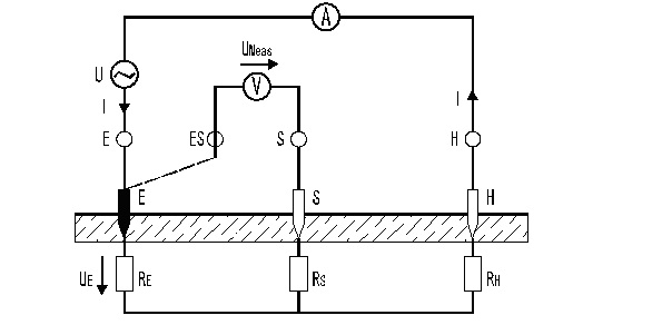 交流源U產(chǎn)生的電流I,流經(jīng)被測接地電阻RE和輔助接地電極RH,在流回電流源U。這樣被測接地電阻RE就有電壓Ue,它可通過探針S檢測和測量。由于電壓測量電路阻抗很高,可以忽略電壓極的電阻RS的影響。電流I通過內(nèi)部的電流測量電路測得。因此被測接地電阻RE=Ue/I。